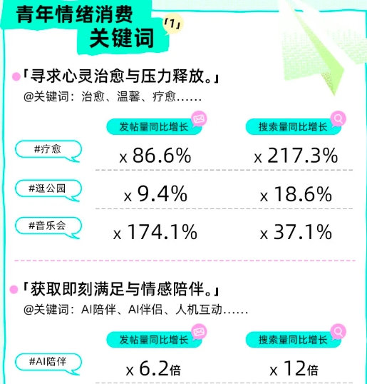 Soul平台的数据同样印证了这一趋势:2025年二季度,社区内与情绪体验相关的话题增长势头迅猛。“疗愈”相关发帖量同比增长86.6%,搜索量更是激增217.3%。“音乐会”发帖量同比增长174.1%,成为年轻人寻求情绪释放的重要场景。更值得关注的是,年轻人对情绪体验的需求呈爆发式增长,“AI陪伴”发帖量同比增长6.2倍,搜索量更是飙升12倍,彰显出Z世代对多元化情绪陪伴的迫切渴望。对他们而言,一次能获得共鸣的聊天、一段沉浸式的兴趣互动,也可以比一件新商品更能带来持久的心理满足。