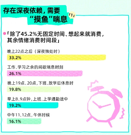 报告显示,深夜22点后是情绪消费的峰值时段,有33.2%的青年会在此时段寻求情绪慰藉。